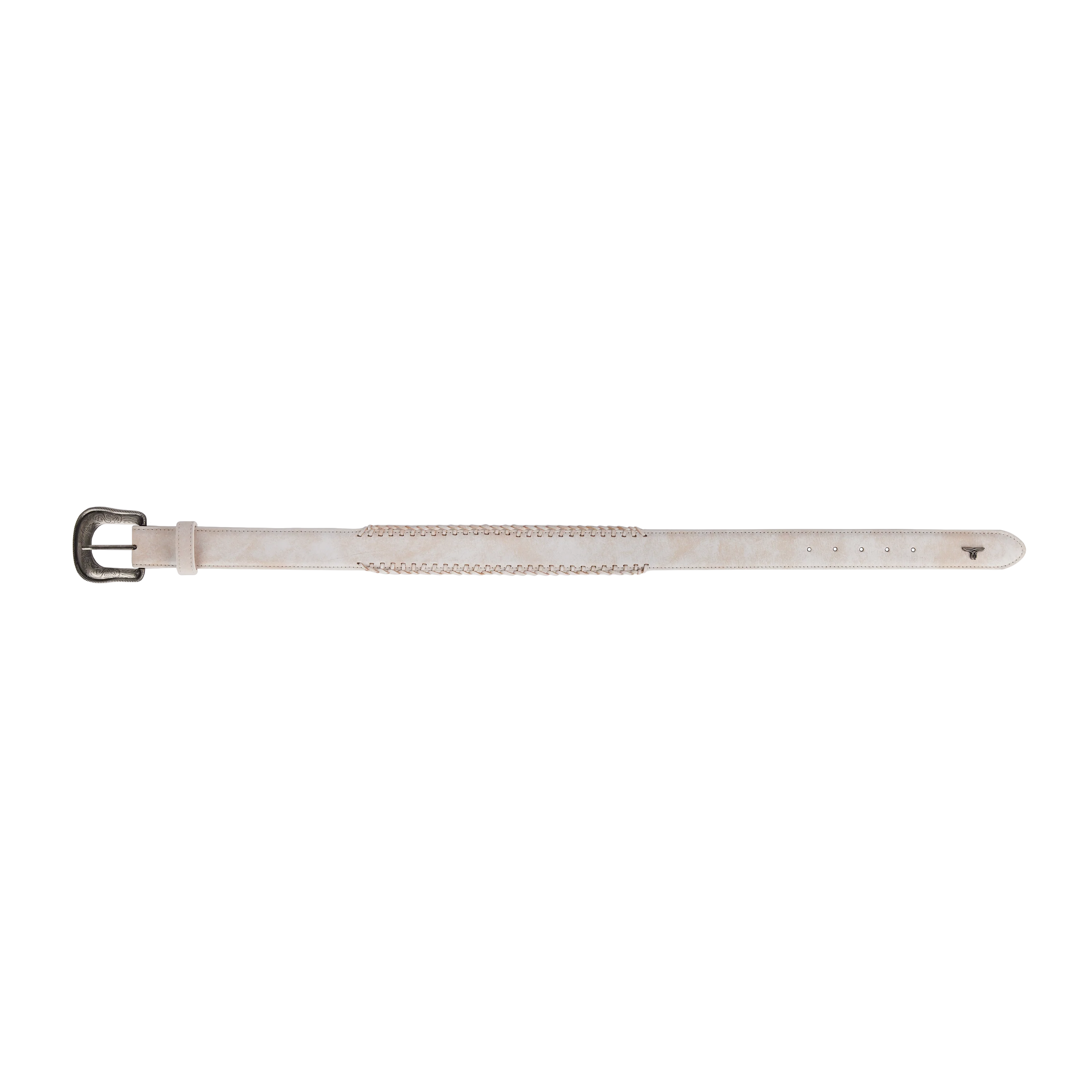 Sophisticated meets Western chic in the Lane Boots Woven Laced Belt, handcrafted from premium genuine leather in our signature off-white ceramic crackle finish. Detailed with two braided lace outlines that frame the belt beautifully, this design blends artistry with authenticity. The antique single buckle adds the perfect touch of classic Western style.