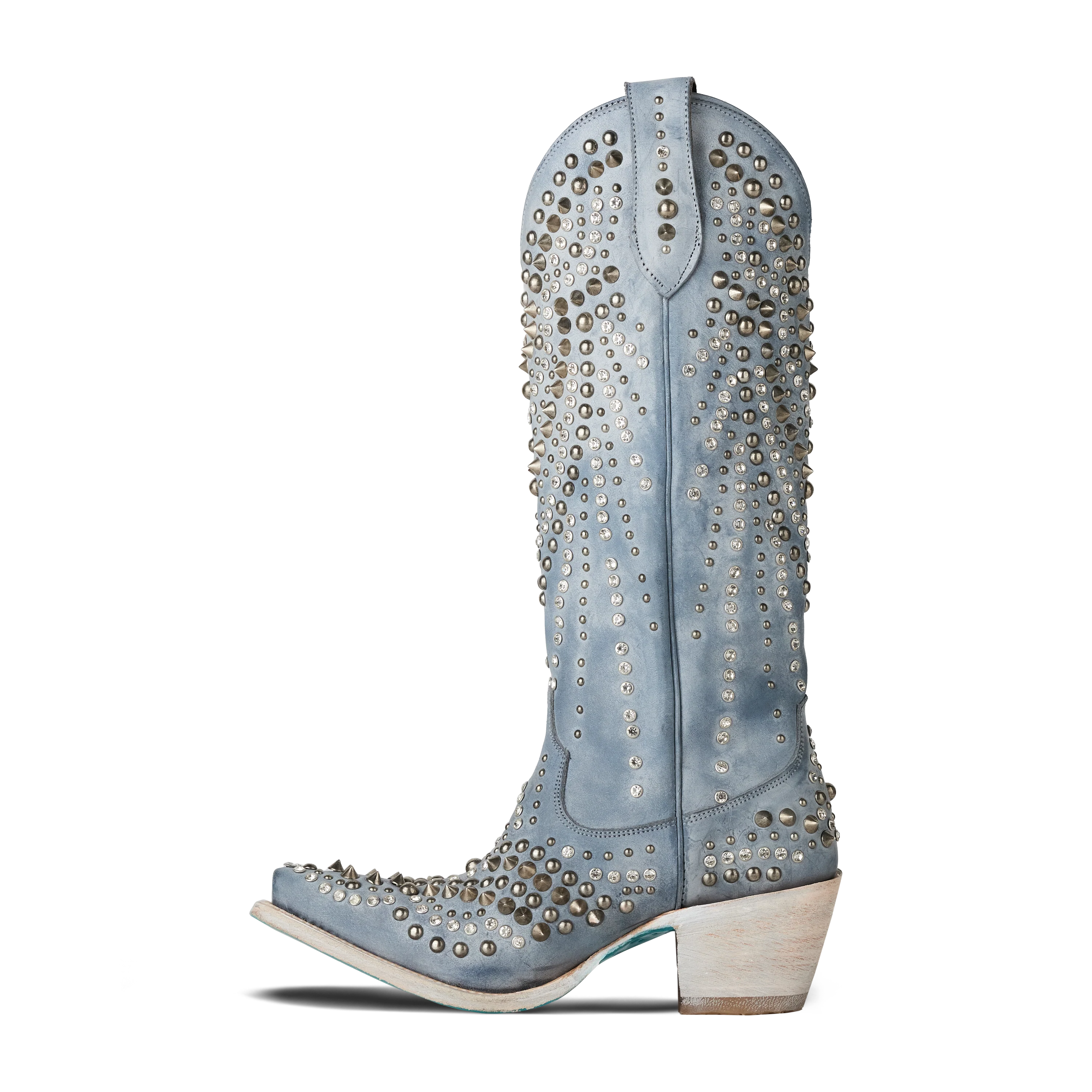 Bold, glamorous, and made to steal the spotlight—the Dolly Boot in Washed Denim is one of our most showstopping designs. Originally created as a bootie, overwhelming demand led us to craft a full boot version, and she’s been turning heads ever since. The smooth washed denim leather creates a striking canvas for an intricate pattern of hand-placed gold studs, arranged in varying sizes to deliver a luminous, high-fashion edge with undeniable attitude.