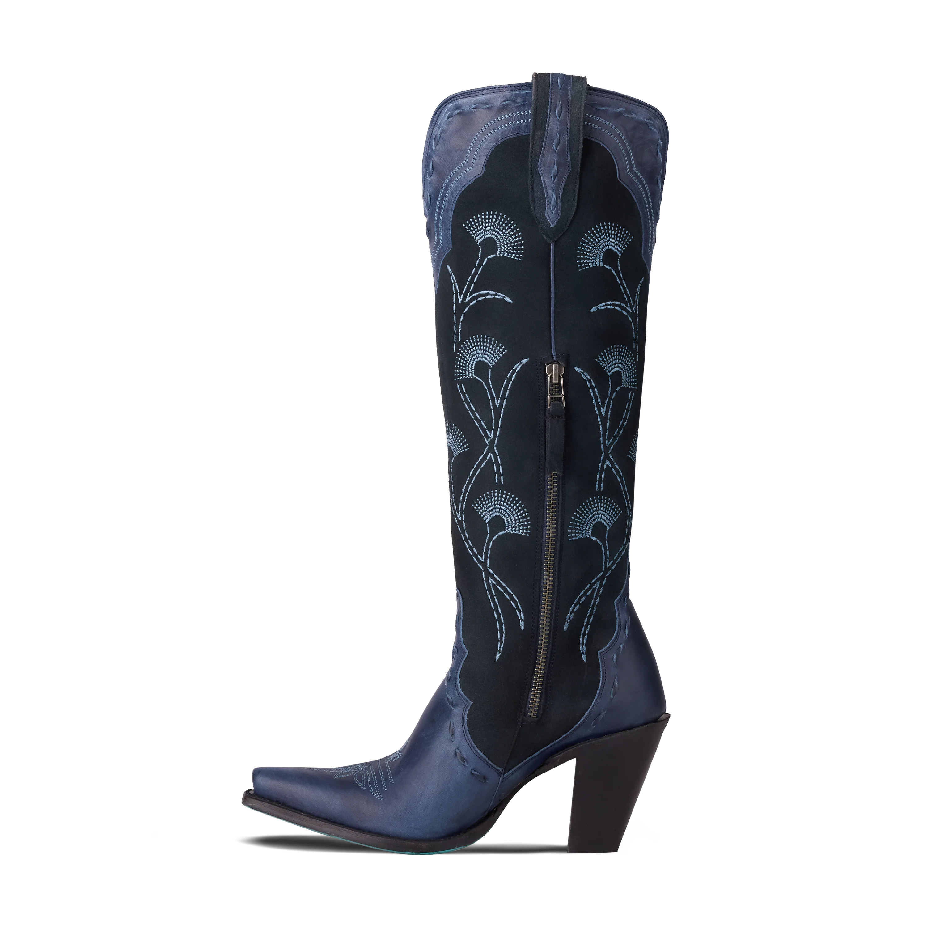 Crafted from top grain leather and ultra-soft navy suede, this knee-high boot features hand-finished buckstitch edging and bold, chunky floral embroidery that adds just the right amount of drama. The modern stovetop silhouette and slimmer shaft fit hug your leg beautifully, while a side zipper keeps things easy without sacrificing that sleek ankle moment.